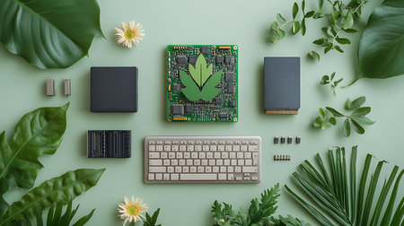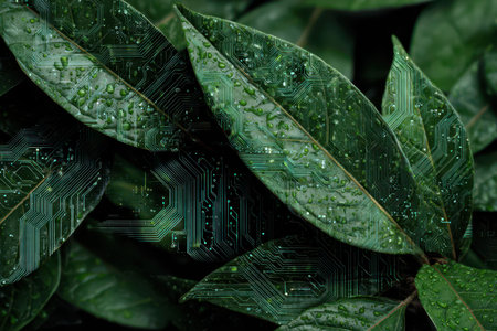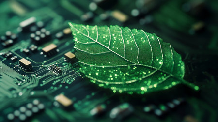 Innovative green technology combines nature and circuits illustrating a sustainable future with leaves and digital elements