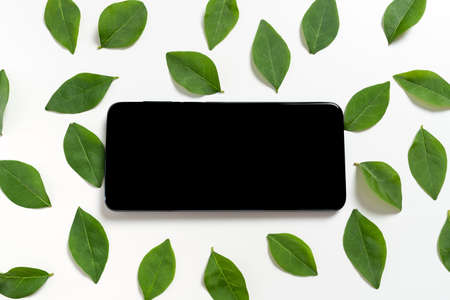 Smartphone With Blank Display Screen Placed Between Fresh Leaves Presenting Modern Technology. Cellphone Surrounded With Foliage Leafage For Creative Business Promotion.
