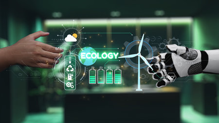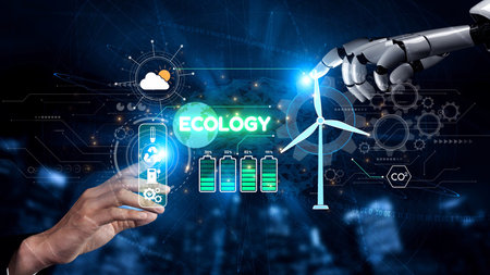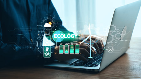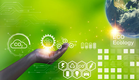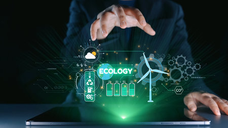 Explore the concept of eco ecology featuring technology and sustainability. The image highlights elements of renewable energy, urban development, and environmental conservation.