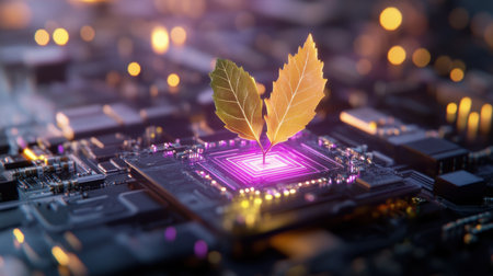 Eco friendly leaf shaped chip on circuit boards symbolizing sustainable technology and innovation