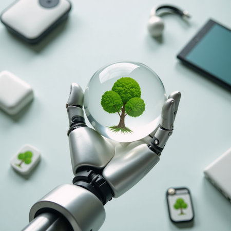 Robot grasps glowing green sphere representing sustainability environmental technology within the context of scientific advancements sustainable development goals SDGs