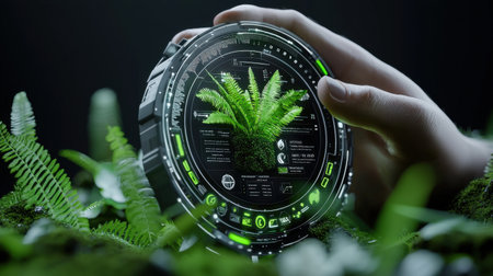 Researcher hand interacts with a glowing holographic screen displaying eco system data, charts, and a leaf icon in a green forest environment, symbolizing environmental monitoring and future technology.