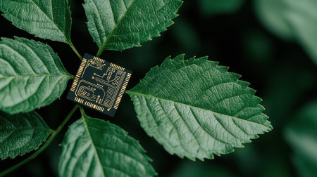 Innovation meets nature: A sleek, modern microchip embedded into a green leaf, symbolizing the harmony between technology and the environment. Copy space.