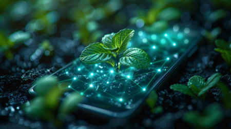 A young green plant emerges from the screen of a smartphone, resting on dark soil. This striking image symbolizes the seamless connection between technology and nature.