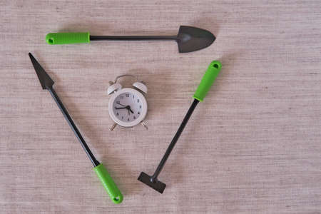Spring creative composition Time to do planting. Three small tools for the home garden around an alarm clock on a textile beige background.