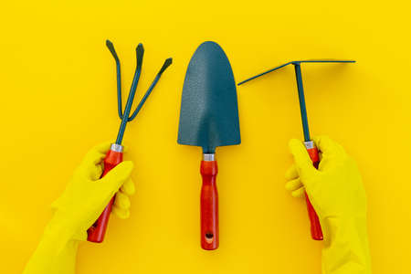 Gardening layout on a yellow background. Gardening gloves and flower shovels. Spring season. Plantings. Landings in the ground. Copy space.