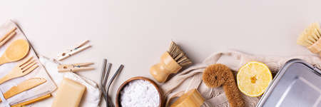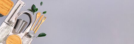 Sustainable lifestyle. Zero waste, plastic free shopping concept. Cotton bags, glass jar, bottle, metal cup, straws for drinking, bamboo cutlery and boxes on gray background. Banner.