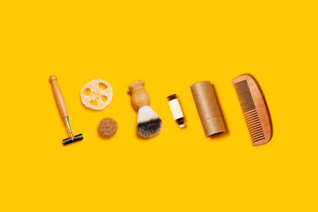 Ecological accessories for body care located on yellow background.