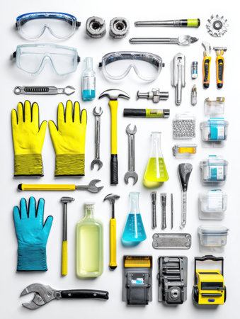 Safety goggles, gloves, and various tools are arranged in an organized manner, highlighting essential items for a workspace focused on hands-on projects.