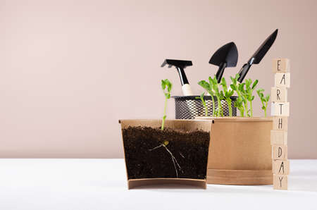 Young sprout of peas with cross section, potted seedlings with wood cubes with letters in stack, rake, shovel on white wood table, beige wall. earth day background.