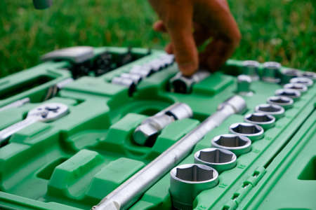 Close-up photo of a set of sockets with a screwdriver and a ratchet in a green plastic case against a background of green grass. Auto tool. Chrome mechanics tools set.