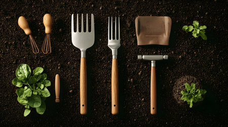 Various gardening implements, soil samples, and small envelopes are neatly arranged for a creative presentation.