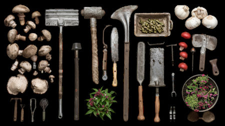 Collection of gardening tools and fresh produce on display