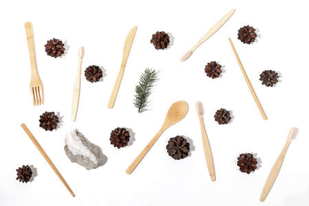 Christmas creative flat lay arrangement of eco-friendly bamboo toothbrushes, wooden cutlery, pine cones, fir twig and stone on white backdrop. Plastic free, zero waste, sustainable consumption.
