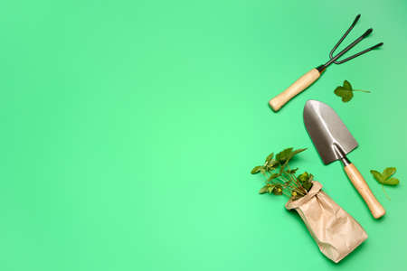 Gardening tools on green background flat lay top view