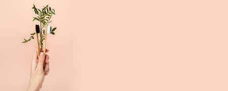 Hands hold one bamboo eco tooth brush. brown color. Dental care. Morning oral healthcare routine. Beige neutral background. Copy space. Washing prevention hygiene, zero waste, eco-friendly