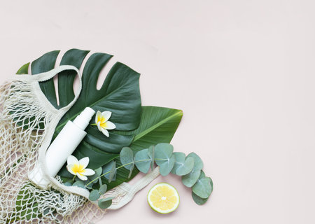 Flat lay composition with eco friendly products on beige background, space for text. banner design