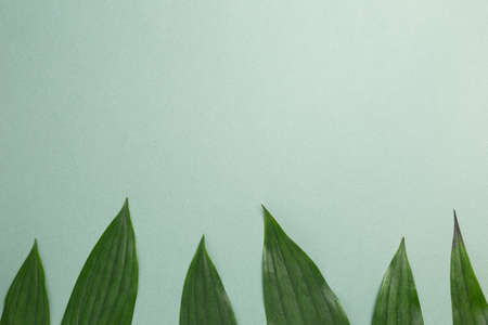 Leaf pattern. Green tropical leaves on mint background. Summer concept. Flat lay, top view, copy space