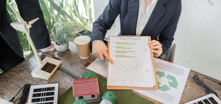 Renewable Energy Strategy and Eco-Friendly Solutions. Professionals reviewing graphs and data on sustainable practices.