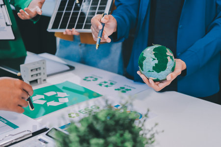Eco business company meeting with group of business people planning strategy and discuss marketing of eco-friendly and renewable clean energy products. Green business company concept. Trailblazing