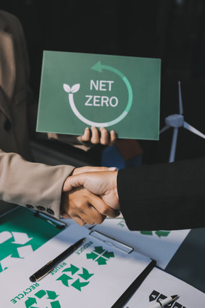 Top view ESG investment project with business leaders in meeting, brainstorm and invest in green project for environmental protection with sustainable net zero and renewable energy technology.Reliance