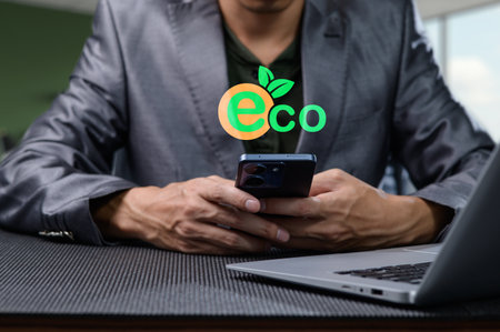 A business professional explores ecological and economic innovations using a smartphone and laptop in an office setting, symbolizing progress and responsibility.