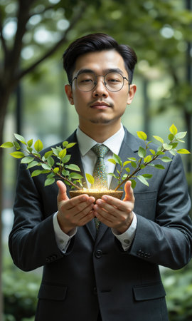 Business people holding plant as concept of eco company committed to corporate social responsible, reducing CO2 emission, protect environment, and embrace ESG principle for sustainable future. Gyre