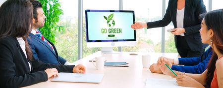 Diverse group of business people discussion business marketing with environmental responsibility for greener ecology. Productive teamwork contribute natural preservation and sustainable future. Quaint