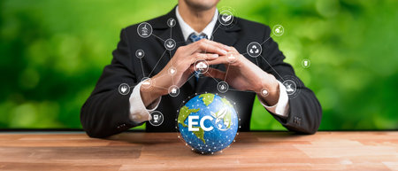 Businessman leader give presentation on eco-friendly implementation in order to reduce CO2 emission and make sustainable ecology for greener future with renewable alternative energy technology. Quaint