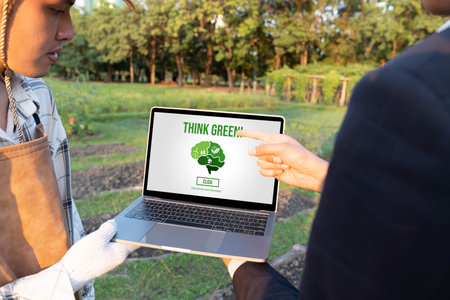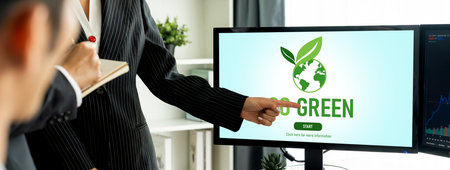 Go green for environmental awareness concept display on laptop on eco-friendly company meeting with businessman initiate environmental protection for clean and sustainable future ecology. Trailblazing