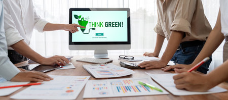 Diverse group of business people planning business marketing with environmental responsibility for greener ecology. Productive teamwork contribute natural preservation and sustainable future. Quaint