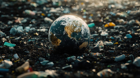 A dirty planet Earth engulfed in garbage and plastic, highlighting the urgent need for environmental action