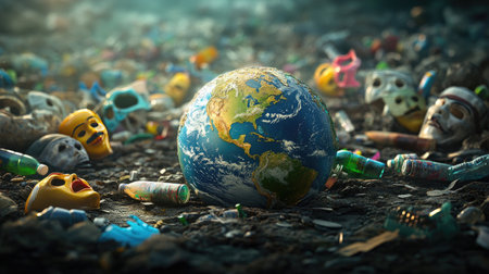 A striking visual representation of the Earth's challenges with plastic pollution, showcasing discarded items and their impact on the environment.