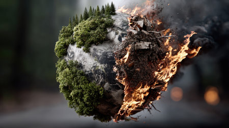 This surreal image portrays a visually striking representation of Earth engulfed in flames and lush forests, highlighting the urgent consequences of climate change.