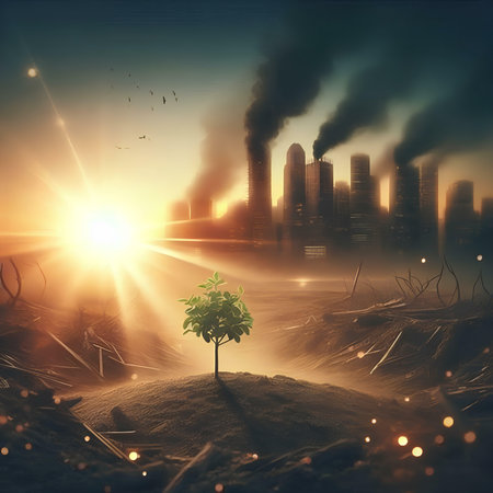 Conceptual image of environmental disaster with a single tree in a polluted city