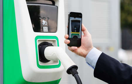 Hands with smartphone on a background of rental car at the charging station for electric vehicles. Car sharing.