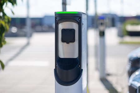 Charging Station Electric Car Charging Station. Shot of modern electric power charging station for EV, PHEV and HEV near store. Electric Vehicle and Bus Charging Points.