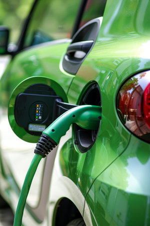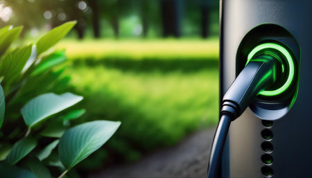 Charger plug in electric car in green environment background. New energy vehicle, NEV is being loaded with electricity power. Ecology, modern day cars