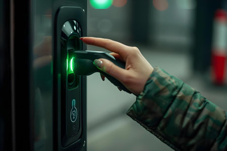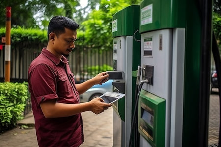 A persons hand pressing a button at an electric vehicle charging station symbolizing ecofriendly transportation. Concept Green Technology, Sustainable Energy, Alternative Transportation
