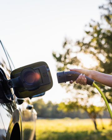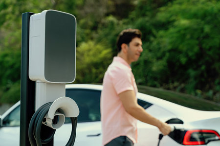 Electric car recharging battery from outdoor EV charger on blur background of man insert electric plug into vehicle with natural scenic as concept of eco-friendly travel with clean energy. Perpetual