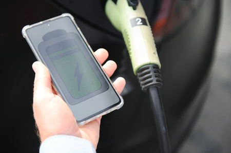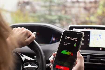 Smartphone app shows charging status of the electric car battery. Electro transport concept