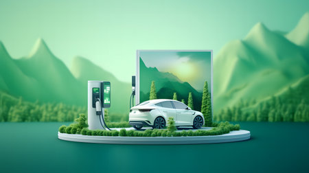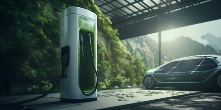 EV charging station for electric car in concept of green energy produced from sustainable resources, Generative AI illustrations.