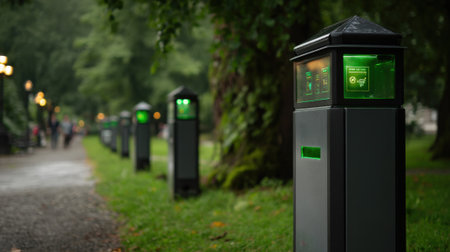 Medium shot of sensorized smart waste bins in a city park clearly displaying fill levels with bright LED indicators against green spaces.