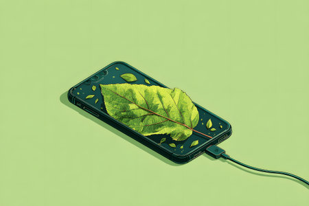A sleek smartphone stands upright against a bright green backdrop, showcasing a wallpaper filled with various green leaves. This composition conveys a fresh, natural vibe.