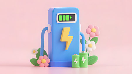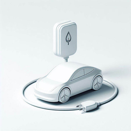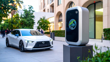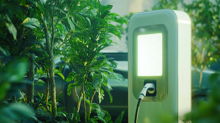Electric vehicle charger surrounded by greenery promoting sustainable energy in an urban environment