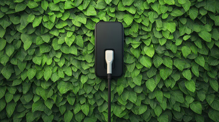 A smartphone charger plugged into a wall covered with vibrant green leaves, showcasing the blend of nature and technology.