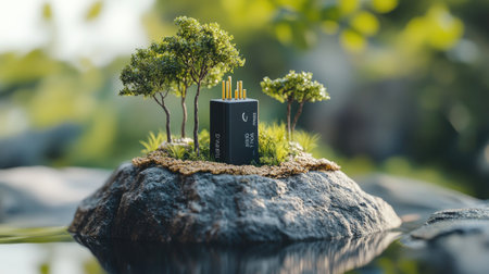 A sleek modern device sits on a stone surrounded by lush miniature trees, reflecting a blend of nature and technology. The serene water backdrop enhances the peaceful atmosphere, inviting reflections on innovation in harmony with the environment.