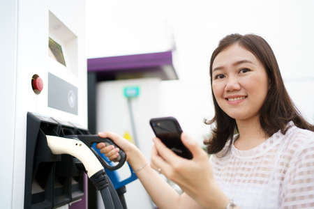 Happy Asian young woman using ev charging application on smartphone connect with the charging station, Bev or electric vehicle charging station. Woman refueling a battery at EV station.