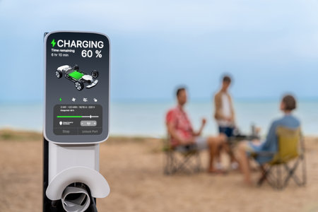 Road trip vacation traveling to the beach with electric car recharging battery with alternative eco-friendly and clean energy. Natural travel with EV car for sustainable environment. Perpetual