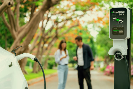 Focused EV car recharging battery on blurred background of lovey couple during autumnal road trip travel with electric vehicle recharging battery. Eco friendly travel on vacation during autumn. Exalt